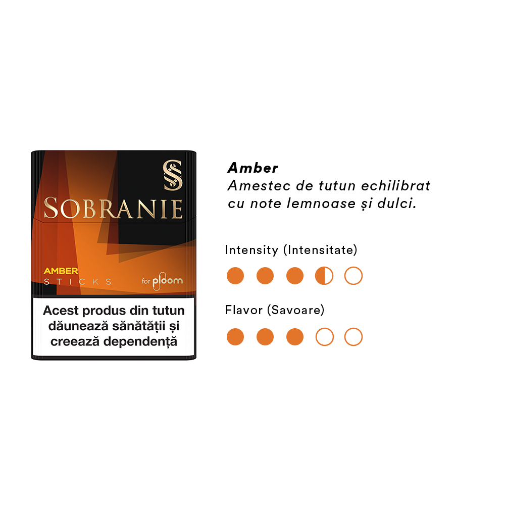 - Sobranie Amber Sticks: amestec de tutun echilibrat cu note lemnoase și dulci.